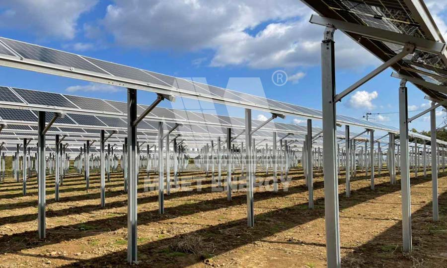 該電站采用邁貝特自主研發的“農光互補支架系統”——一款將光伏支架系統與農業種植大棚完美融合的產品。該系統已經通過TUV專業測試并取得相應報告,主體為鋁合金材質,按照大跨距結構進行設計,絲毫不影響農業機械設備的日常操作。立柱可根據項目需求選用合適的方管,多種方管無縫切換,在大跨距結構下仍然擁有出色的承重性能。具有獨家專利的T型卡槽,搭配立柱、接頭、后斜拉撐,可實現大棚支架的靈活調整,有效減少施工隊的安裝時間。